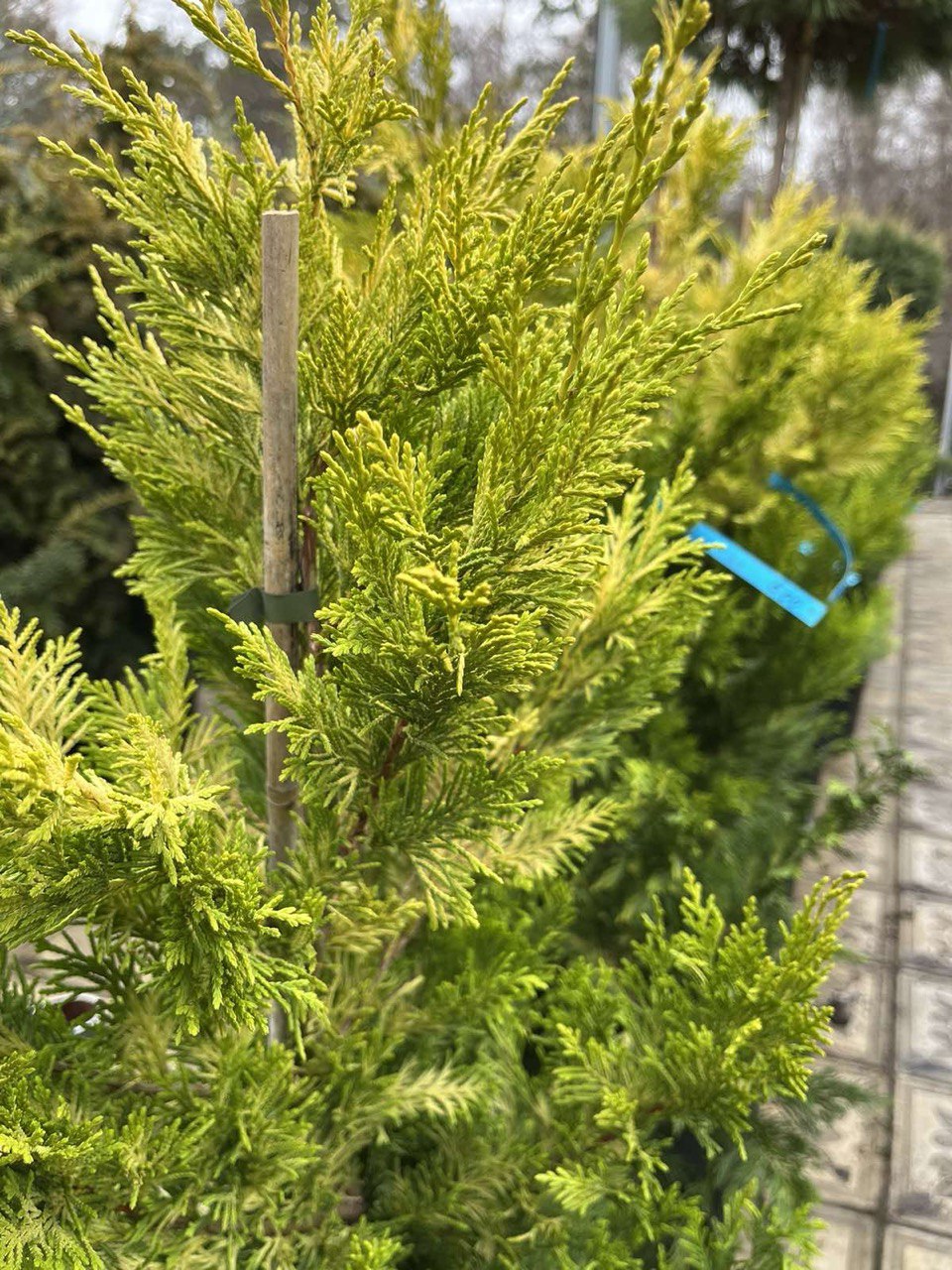 Aspect: frunziș galben-auriu intens, persistent tot timpul anului, cu nuanțe care rămân vizibile chiar și iarna; formează o coroană densă și conică.