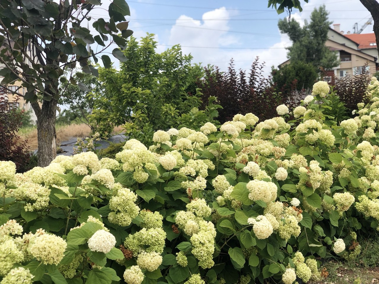 Flori: inflorescențe sferice, foarte mari (20–30 cm), albe, ușor verzui spre toamnă