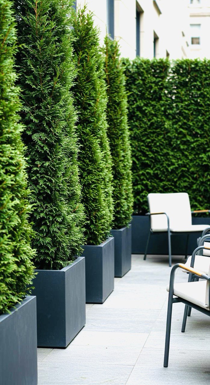 Thuja occidentalis ‘Brabant’ este una dintre cele mai populare plante pentru gard viu, iar varianta în bloc este ideală pentru terase moderne.